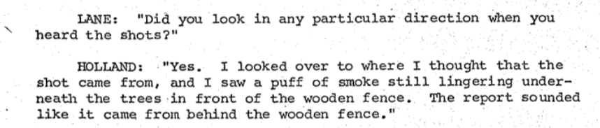 Now Holland is saying the smoke came from the second shot, but not from the third shot which hit JFK in the head. And so the head shot, according to Holland, did not come from the grassy knoll.